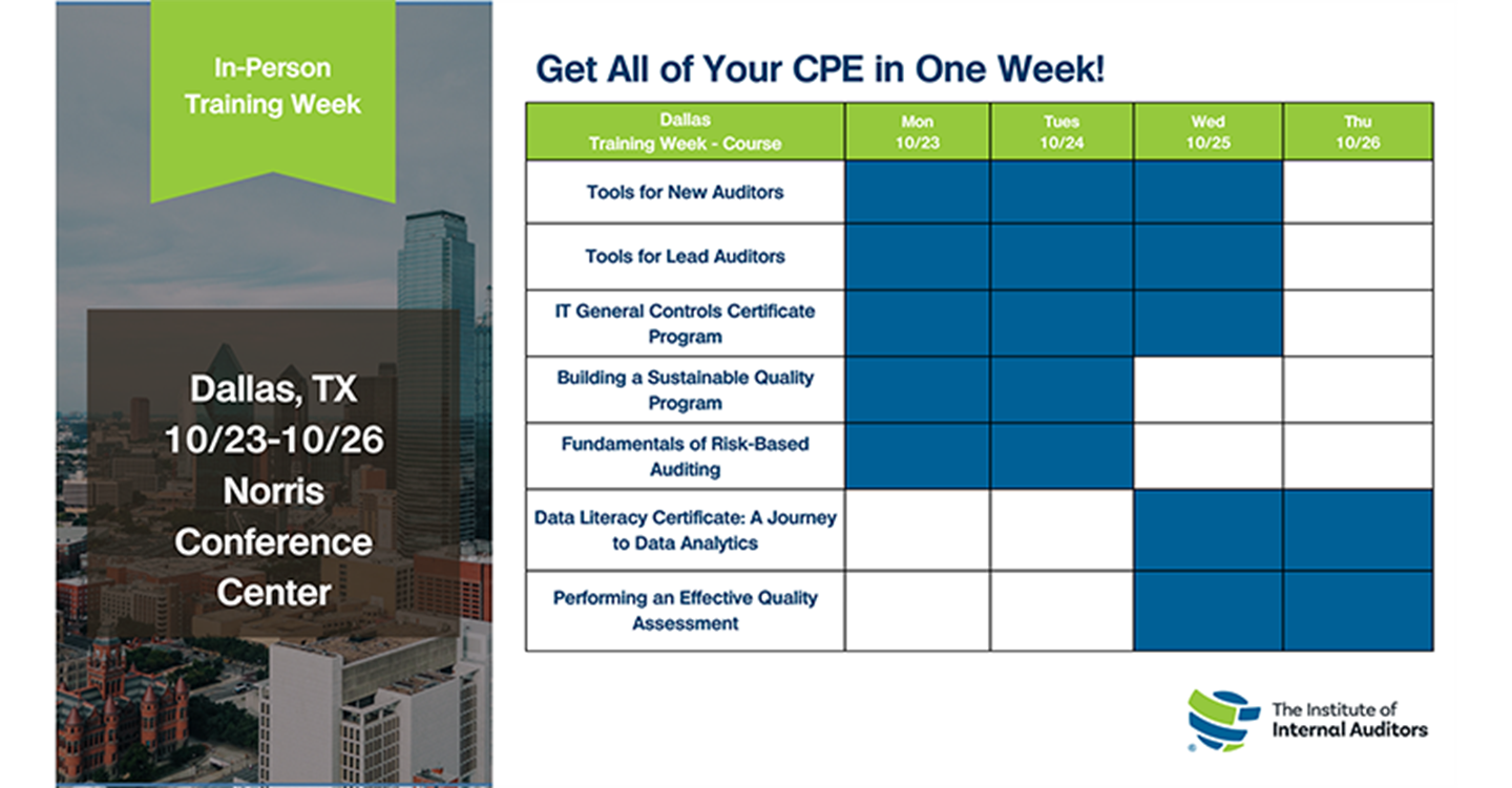 Led by leaders in internal auditing, multi-day in-person Instructor-Led Training provide a personalized learning experience that adjusts to your needs and skill levels. You will gain a better understanding of the latest audit industry best practices, proven techniques, and trending issues through exercises and group discussions.
